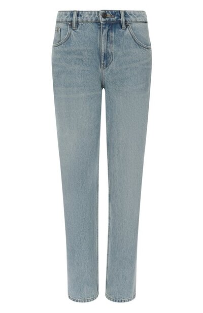 Для пошива выбеленных джинсов выбрали хлопковый деним плотностью 13,5 унций. Модель с брендированным патчем на поясе дополнили традиционными пятью карманами.
