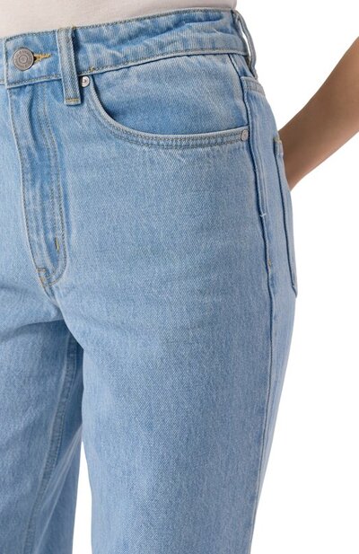 Джинсы Wide Leg 415 украсили патчем с логотипом на поясе. Брюки с пятью карманами сшили из выстиранного денима плотностью 13,5 Oz, произведенного из органического хлопка.