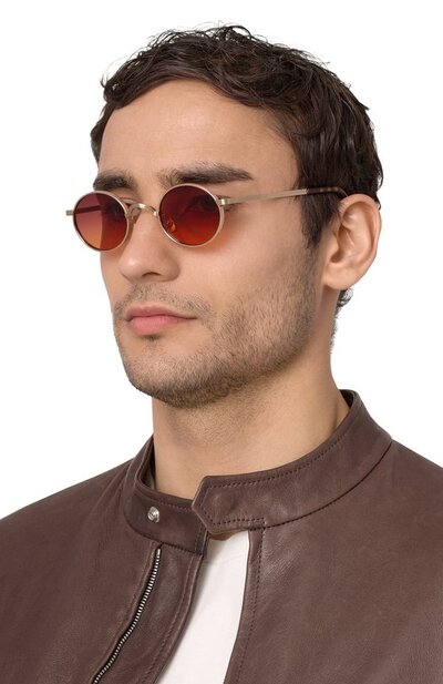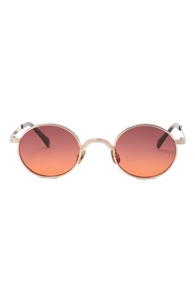 Тонкую оправу круглых очков Moyel с титановыми носоупорами и заушниками из черепахового ацетата выполнили из металла с золотистым покрытием. Линзы, тонированные вручную в оттенок New York Rose, обеспечивают 100% защиты от ультрафиолетовых лучей.