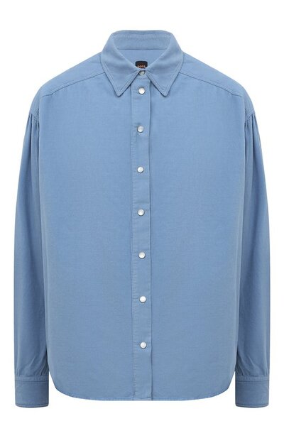 Для пошива свободной рубашки небесно-голубого оттенка использовали мягкий фактурный хлопок, который будет поддерживать комфортный для тела микроклимат в течение всего дня. Наши стилисты предлагают носить модель со спущенной линией плеч и длинными рукавами не только на голое тело, но и поверх легкого топа.