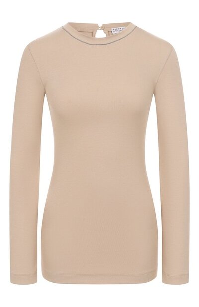 Для изготовления облегающего лонгслива с пуговицей сзади использовали стрейчевый хлопковый трикотаж в рубчик. Круглую горловину подчеркнули фирменной ювелирной цепочкой мониль.