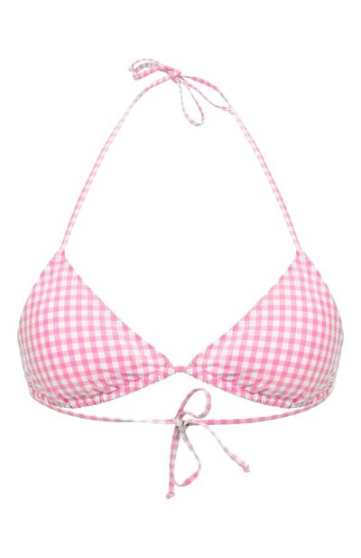 Бра Leah в мелкую клетку «виши» выполнили из быстросохнущего эластичного материала на основе полиэстера. Посадка модели с мягкими треугольными чашечками регулируется двумя парами шнуров, заменяющих пояс и бретели.