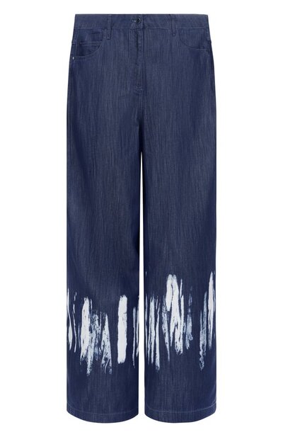 Широкие джинсы из чистого хлопка оттенка Midnightblue украсили контрастным принтом, выполненным в технике тай-дай. Модель с пятью карманами составит гармоничный дуэт с парной рубашкой.