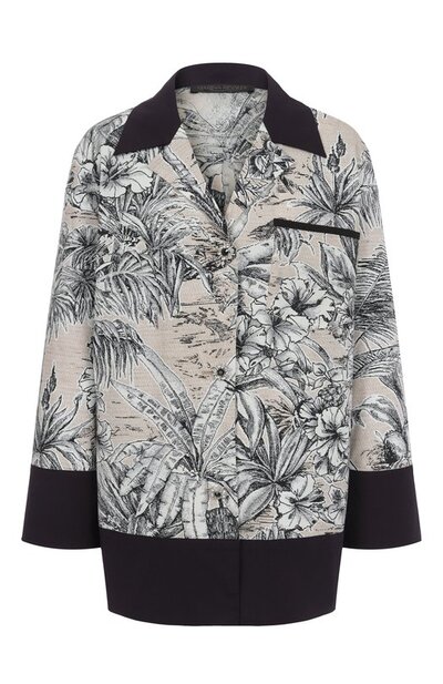 Рубашку Poltava сшили из эластичного хлопкового поплина с имитацией рогожки и тропическим принтом. Модель с контрастной отделкой и нагрудным карманом застегивается кристальными пуговицами.