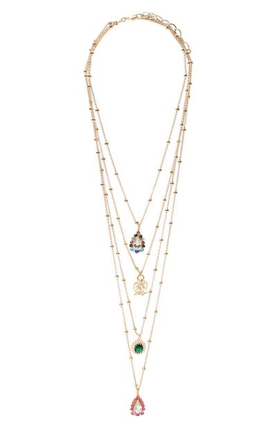 Регулируемое по длине колье составили из четырех латунных цепочек с гальваническим покрытием золотом. Часть звеньев аксессуара заменили миниатюрными бусинами, а ярусы разной длины подчеркнули подвесками с цветными кристаллами хрусталя.