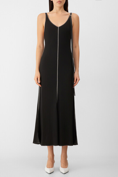 Платье Max Mara из коллекции Sportmax — воплощение элегантной непринужденности. Модель выполнена из мягкого и воздухопроницаемого вискозного трикотажа черного цвета, который идеален для знойного лета. Силуэт «русалка» с глубокими вырезами на груди и спине придает образу женственность и уязвимость, а эластичная легкая ткань гарантирует идеальную посадку. Изделие с акцентными белыми швами дополнено регулируемой удлиненной бретелью с золотистой фурнитурой — акцентная деталь в фирменном стиле на лаконичном платье.
