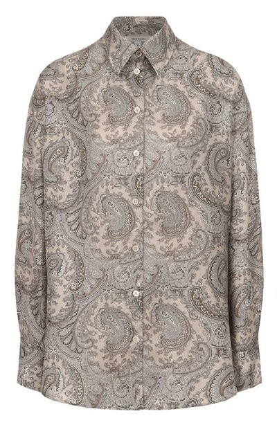 Для пошива рубашки использовали тонкую шелковую ткань с принтом пейсли. Модель с бантовой складкой на спинке фигурным низом и слегка спущенной линией плеч дополнили манжетами на двух пуговицах.