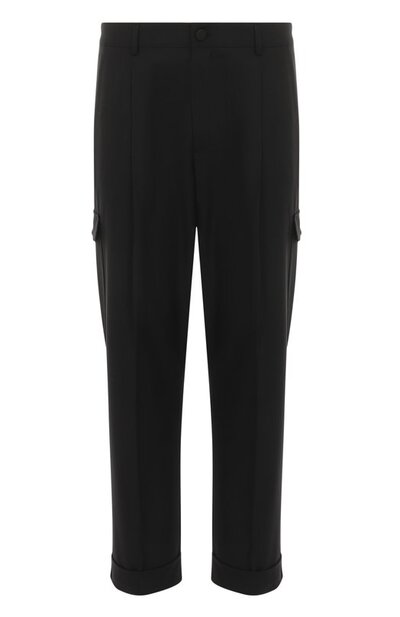 Брюки с боковыми и задним прорезным карманами дополнили двумя карго с клапанами. Для изготовления модели с отворотами и стрелками использовали чистую шерсть. Эластичный пояс изделия украсили брендированным патчем сзади.