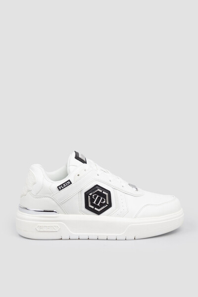 Сникеры LO-TOP SK8R с культовой символикой бренда Philipp Plein. Для производства изделия белого цвета используется комбинация из прочной искусственной кожи и сетки. Отличительными деталями являются перфорация на носке и по бокам, вставка с геометрическим мотивом в виде культового шестигранника PP Hexagon в задней части и стабилизатор пятки из никелированного металла. Атрибутами Дома стали серебристый прямоугольный лейбл с гравировкой на чёрной вставке на язычке и снизу на шнуровке, а также контрастная деталь с металлической монограммой в центре на боковинах.