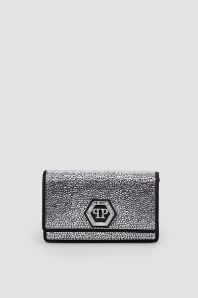Блестящая мини-сумка от бренда Philipp Plein. Поверхность прямоугольной модели, выполненной из бархатистой чёрной замши, усыпана стразами-кристаллами разного размера. Изделие застёгивается с помощью откидного клапана на потайной магнитной клёпке и отличается наличием скользящей металлической цепочки с карабинами для удобства переноски. Атрибутом Дома является крупный сверкающий символ PP Hexagon, размещённый на кожаной вставке спереди.