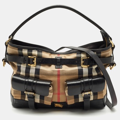 A fine handbag by Burberry thats perfect to use from workday to the weekend. Made from House Check canvas and brown leather, the hobo flaunts a single top handle, a shoulder strap, and black tone hardware. The interior is lined with fabric and sized to hold all your belongings.