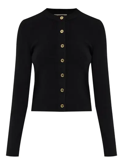 black ribbed texture long sleeves round neck button front gold-tone buttons