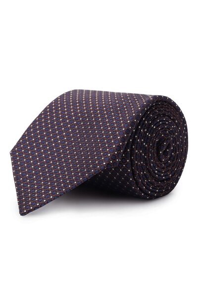 Галстук стандартной ширины выполнили из фактурного шелкового жаккарда с геометрическим узором. Аксессуар из такой ткани легко укладывается в узел и долго не теряет изначальную форму.