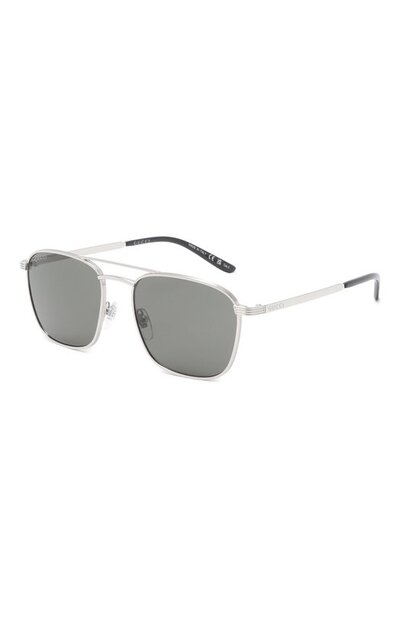 Солнцезащитные очки с металлической оправой дополнили контрастными заушниками и затемненными линзами. Рамку и крепления брендированных дужек у модели подчеркнули рельефными полосами.