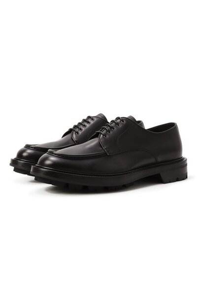 Дерби с миндалевидным мысом сшиты вручную из полированной телячьей кожи. Туфли без декора дополнены массивной резиновой подошвой Commando с глубоким протектором.