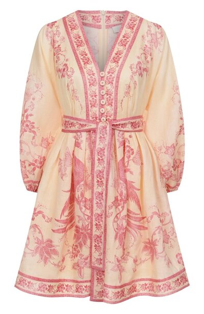 Мини-платье Lucky Plunge с объемными рукавами и двумя карманами сшили изо льна с цветочным принтом. Модель с глубоким V-образным вырезом, декоративными вязаными пуговицами и поясом-лентой застегивается потайной молнией сзади.