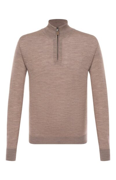 Для изготовления джемпера использовали меланжевый шерстяной трикотаж. Под воротником-стойкой сзади у изделия расположили эмблему Arrow, форму которой повторяет пуллер на короткой молнии.