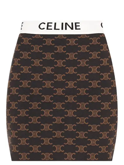 -Коричневая трикотажная мини-юбка купажированного состава от CELINE. -Модель облегающего силуэта с высокой посадкой и эластичным поясом с жаккардовым логотипом бренда. -Юбка составит комплект с парным трикотажным топом из коллекции бренда.