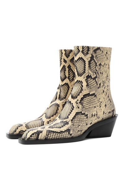 Ботильоны с боковой молнией выполнили из козьей кожи с узором под питона, а для внутренней отделки изделия использовали наппу. Модель с удлиненным зауженным мысом поставили на скошенный каблук.