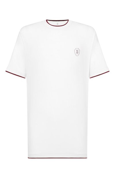 Для пошива футболки прямого кроя использовали гладкий трикотаж стрейч на основе полиэстера. Модель с рельефной эмблемой Solomeo спереди дополнили контрастным кантом вдоль круглой горловины и на манжетах.