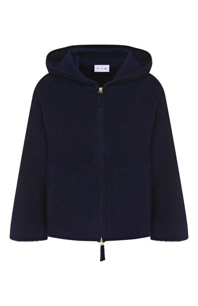 Для изготовления укороченного кардигана с рукавами 3/4 использовали махровый трикотаж из органического хлопка, кашемира и фирменного лиоцелла SeaCell, полученный из бурых морских водорослей. Модель с капюшоном и боковыми карманами застегивается встречной молнией.