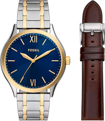 Мужские кварцевые часы. Центральные часовая, минутная и секундная стрелки. Синий циферблат. Круглый корпус выполнен из нержавеющей стали с частичным IP покрытием цвета желтого золота. Диаметр корпуса составляет 44 мм. Стальной браслет с частичным покрытием шириной 18 мм, длина браслета 200 мм, раскладывающаяся застежка. Прочное минеральное стекло устойчивое к мелким механическим повреждениям. Водостойкость WR 50 (мытье рук, дождь). В комплекте коричневый кожаный ремешок.