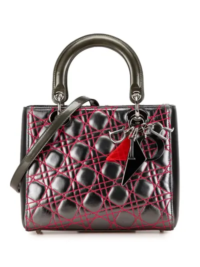 The Medium Lady features a quilted metallic lambskin leather body, structured leather handles, a detachable flat leather strap, a top zip closure, and an interior zip pocket. Gray. Serial Number: 15-BO-1101. Inclusions: authenticity card, shoulder strap. Condition: GOOD. This previously owned and used item is in good condition with minimal signs of use. This may include fading of material or plating and scratches. Please refer to the photos on this product page for a detailed view of the item, including any damages declared.