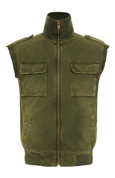 Хлопковый жилет с погонами напоминает куртку, у которой отрезали рукава, оставив необработанными края. Утепленную модель с трикотажными низом и воротником-стойкой дополнили двумя нагрудными карманами с клапанами и парой прорезных по бокам. Выбеленный оттенок и потертости придают изделию винтажный вид.