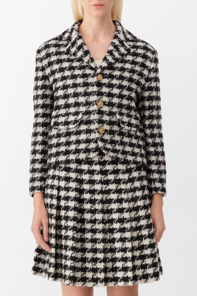 Чёрно-белый жакет Garance от Celine с двумя прорезными карманами с клапанами. Для производства изделия на круглых брендированных пуговицах из металла золотого оттенка используется мягкая фактурная ткань нате - приятное на ощупь гладкое полотно саржевого переплетения, изготовленное на основе шерсти, прочного нейлона, пряжи из шерсти ангорской козы и гладкого шёлка. Наши стилисты рекомендуют носить модель в тандеме с парной юбкой с геометрическим мотивом «гусиная лапка» из той же коллекции.