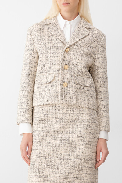 Прямой жакет Garance от Celine с узором чёрного цвета и в оттенке слоновой кости. Для создания однобортной модели в стиле smart casual выбран мягкий трикотаж на основе хлопка, прочного полиэфира и акрила с фактурной поверхностью. Внутри - брендированная кремовая подкладка из прочного вискозного волокна и модала. Образ можно завершить парной юбкой-карандаш ниже колена из той же коллекции.