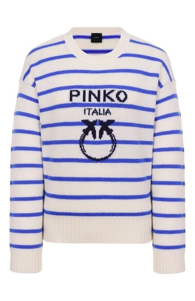 Пуловер с эластичными манжетами и поясом связали из шерстяной пряжи. Спереди модель в бретонскую полоску украсили логотипом марки и фирменной эмблемой Love Birds.
