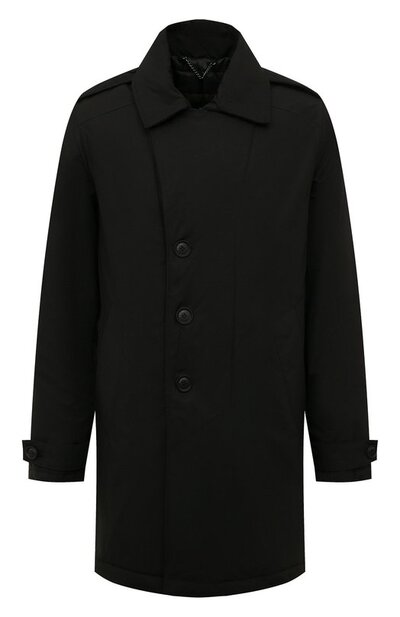Лаконичный плащ универсального черного оттенка выполнили из мягкого прочного полиэстера, который защищает от ветра и легко очищается от загрязнений, не требуя особенного ухода. Модель наполнили отборным пухом и пером, сохраняющими комфортную для тела температуру в холодную погоду.