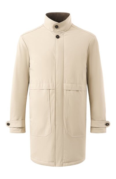 Для пошива плаща с воротником-стойкой использовали гладкий полиэстер. Внутри предусмотрели подклад с добавлением вискозы. Модель с потайными пуговицами дополнена двумя накладными карманами и еще одним внутренним на пуговице.