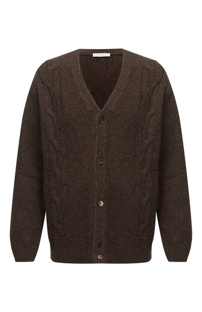 В кардигане цвета темного дерева соблюли хрупкий баланс между теплом, легкостью и мягкостью. Модель из осенне-зимней коллекции связали из нежной пряжи, в основе которой лежит фирменная шерсть. Тактильные свойства приумножает тонкий кашемир, согревающий горных коз суровой зимой. Изделие украсили арановым узором по бокам.
