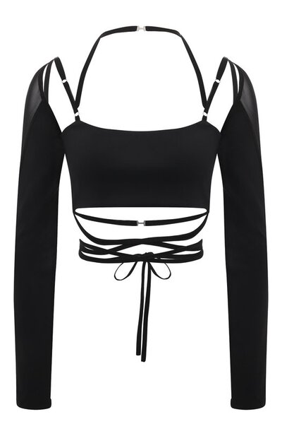 При создании черного топа сыграли на контрасте, противопоставив длинные рукава укороченному крою и глубокому вырезу, открывающему плечи. Провокационный силуэт подчеркивают узкие бретели и тонкие ленты, обвивающие талию. Модель выполнили из гладкого плотного текстиля и полупрозрачного материала.