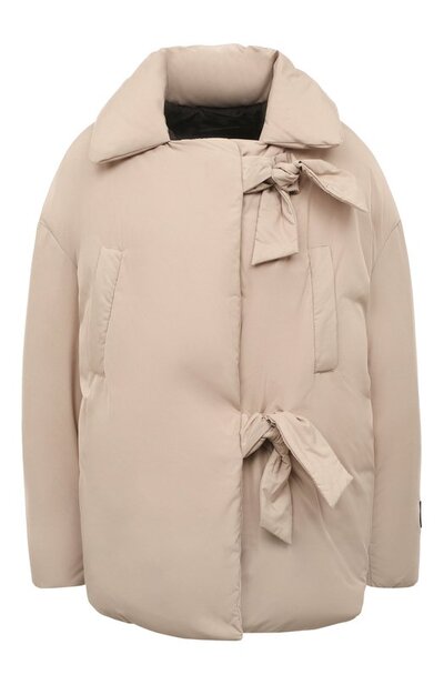 Для пошива бежевого пуховика с широким отложным воротником и спущенной линией плеч мастера марки использовали шелковистый непродуваемый полиэстер. За поддержание комфортного микроклимата отвечает наполнитель из гусиных пуха и пера. Модель с потайной молнией дополнили небольшими лентами, которыми фиксируется запах.