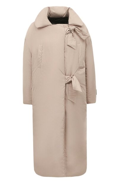 Для изготовления бежевого пуховика, напоминающего пальто с запахом и спущенной линией плеч, мастера марки использовали плотный материал, хорошо защищающий от ветра. За сохранение тепла отвечает почти невесомый слой гусиных пуха и пера. Изделие застегивается встречной молнией и дополнительно завязывается двумя широкими лентами.