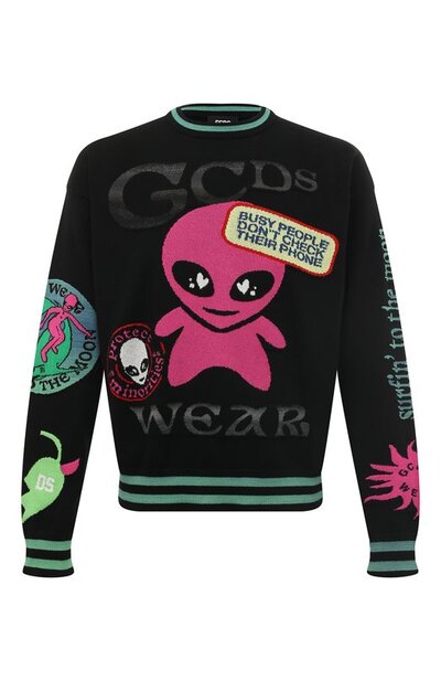 Черный свитер с круглой горловиной, спущенной линией плеч и длинными рукавами украшен крупными красочными изображениями инопланетян и логотипами бренда. Легкая модель выполнена из тонкой хлопковой пряжи, в которую вплели невесомые волокна шерсти мериноса. Предлагаем создать образ с шортами и кедами в тон.