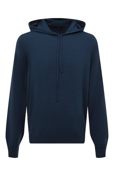 Дизайнеры бренда сделали худи спокойного синего оттенка максимально комфортным для прохладной погоды. Привычный для таких вещей футер они заменили легким кашемиром, который сохраняет тепло в восемь раз лучше обычной шерсти. Волокна материала тщательно вычесали и вручную очистили от жестких волосков, чтобы в пряжу попали только самые нежные нити.