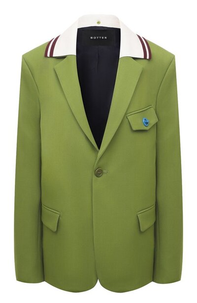 Свободный жакет с четко очерченной линией плеч возьмет на себя основную смысловую нагрузку в наряде. Прямую модель сшили из плотной полушерстяной саржи травяного цвета, а ярким акцентом сделали бирюзовую поворотную застежку на нагрудном кармане. Однобортное изделие выглядит так, будто под него надели поло: широкие лацканы дополнили трикотажным воротником, который можно отстегнуть.