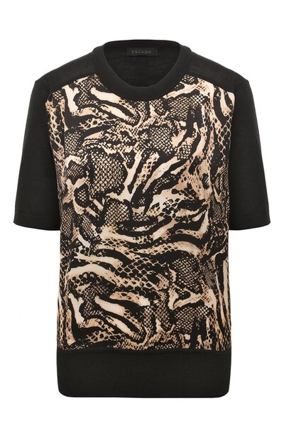 Черный пуловер с короткими рукавами делает особенно эффектным вставка со змеиным мотивом спереди. Для изготовления модели использовали нежную пряжу, сочетающую тонкую шерсть и гладкий шелк. Изделие из такого материала не подвержено пилингу, поэтому долго будет выглядеть безупречно.
