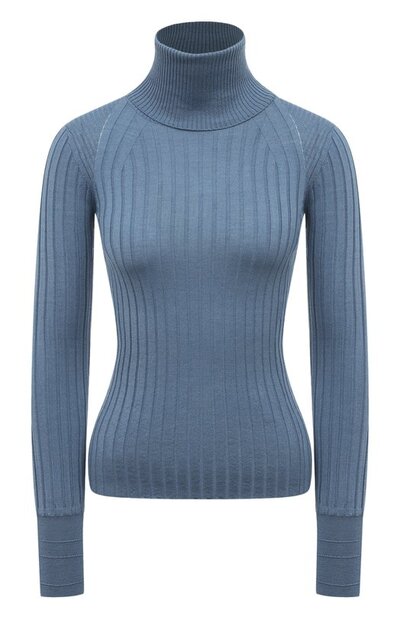 Голубая водолазка с рельефным узором в вертикальную полоску станет хорошим компаньоном и для повседневных джинсов, и для лаконичных брюк. Модель с рукавами «реглан» выполнили из мягкого полушерстяного трикотажа с добавлением прочного шелка и отборного кашемира. Изделие из такого материала поддерживает оптимальный микроклимат и комфортно садится по фигуре.