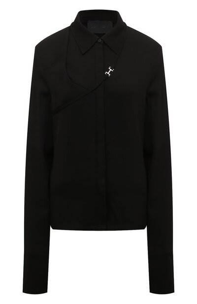 Блузу с удлиненными рукавами и отложным воротником сшили из эластичной вискозной ткани. Прямую модель на потайных пуговицах дополнили съемной деталью, которую можно носить через плечо.