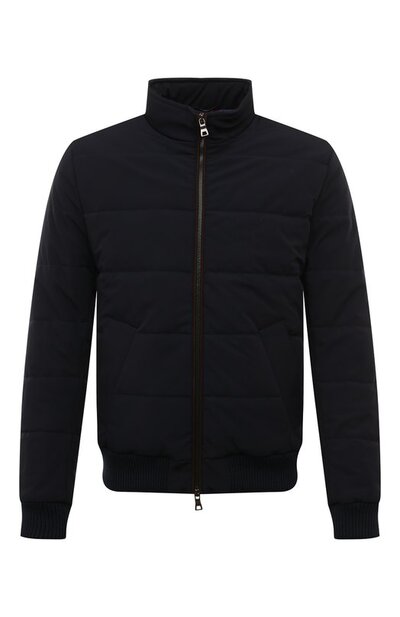 Мастера бренда сшили темно-синий стеганый бомбер из гладкого плотного материала, в составе которого соединили нейлон и полиэстер. Изделие из такой ткани хорошо защищает от ветра, а за сохранение тепла отвечает легкий наполнитель. Куртка с воротником-стойкой застегивается встречной молнией.