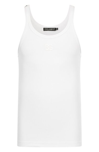 Майку с брендированной контрастной нашивкой на одной бретели украсили вышитой в тон монограммой DG спереди. Модель изготовили из хлопкового трикотажа в рубчик.