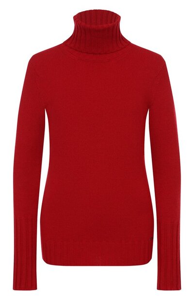 Свитер связали гладью из кашемировой пряжи. Сбоку модель с рифлеными поясом, удлиненными манжетами и высокой горловиной украсили небольшой брендированной пластиной.