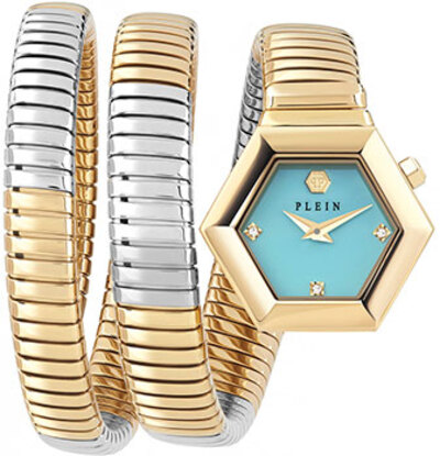 Женские кварцевые часы. Центральные часовая и минутная стрелки. Голубой циферблат украшен кристаллами. Шестиугольный корпус выполнен из нержавеющей стали с IP покрытием цвета желтого золота. Диаметр корпуса составляет 28 мм, толщина 8 мм. Стальной браслет-петля в несколько оборотов с частичным покрытием. Прочное минеральное стекло устойчивое к мелким механическим повреждениям. Водостойкость WR 50 (мытье рук, дождь).