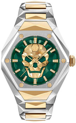 Мужские кварцевые часы. Центральные часовая, минутная и секундная стрелки. Зеленый циферблат с фирменным изображением черепа. Шестиугольный корпус выполнен из нержавеющей стали с частичным IP покрытием цвета желтого золота. Диаметр корпуса составляет 45 мм, толщина 13 мм. Стальной браслет с частичным покрытием шириной 15 мм, раскладывающаяся застежка. Прочное минеральное стекло устойчивое к мелким механическим повреждениям. Водостойкость WR 50 (мытье рук, дождь).