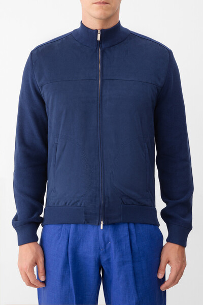 Кардиган ZILLI на встречной молнии с двумя брендированными пуллерами. Для производства модели прямого силуэта выбрана комбинация из мягкого трикотажа на основе хлопка и гладкого шёлка синего цвета, связанного лицевой гладью, и вставки из бархатистой замши спереди в тон. Конструкция изделия характеризуется наличием высокого воротника-стойки и двух боковых карманов для хранения мелких предметов.