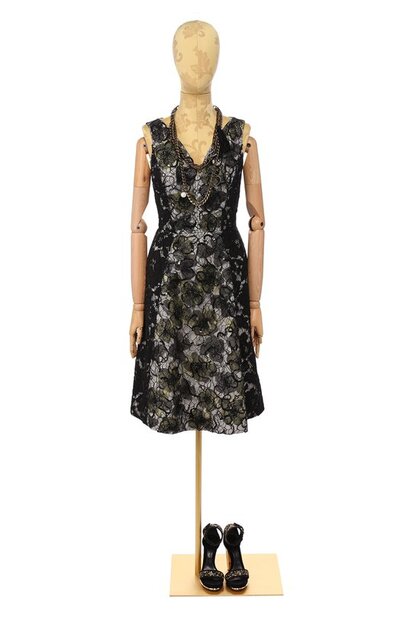 Разноцветное коктейльное платье с V-образным вырезом — редкий экземпляр авторства Питера Коппинга для бренда, основанного Оскаром де ла Рентой. При создании модели дизайнер сделал ставку на тонкое ажурное кружево с цветочным узором и вышивку мерцающими пайетками и бисером. Изделие из межсезонной коллекции наши стилисты включили в винтажное собрание TSUM Vintage.
